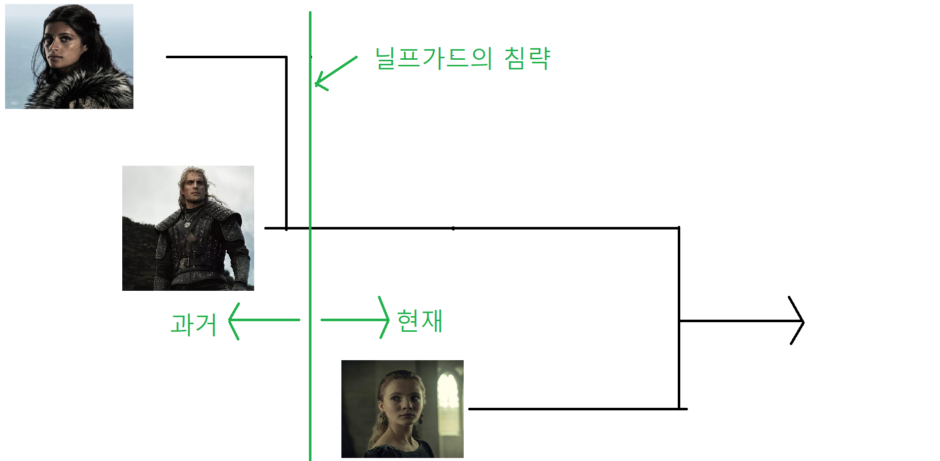 그림판으로 그려서 퀄리티가 낮지만, 이 정도로만 시간의 순서를 알고 계셔도 드라마 위쳐의 내용을 이해하시는 데는 큰 문제는 없을 것입니다.