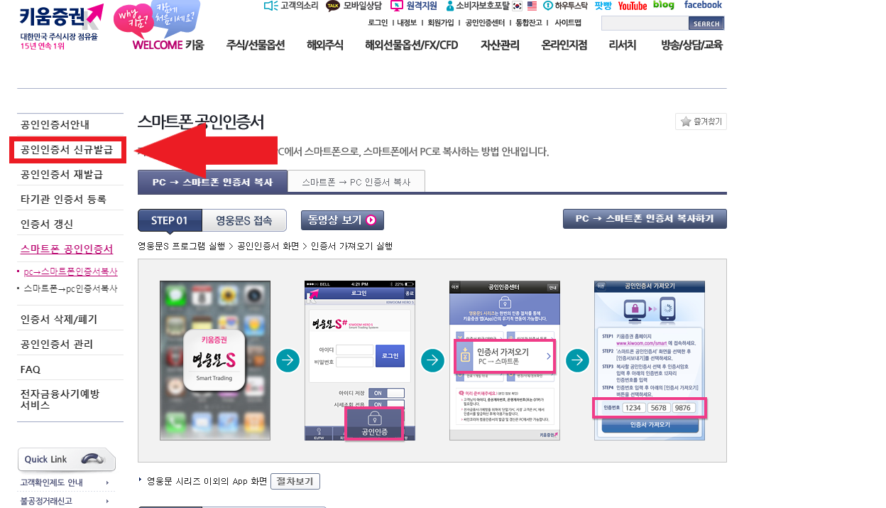 a. 키움증권 홈페이지 들어간 다음 인증서 복사 누르기
