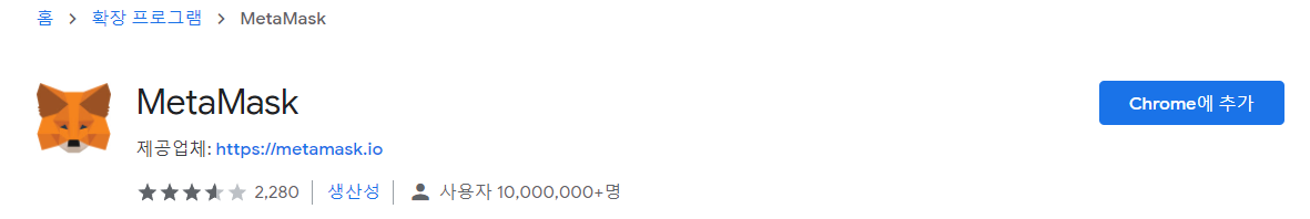 크롬 웹스토어로 이동이 되면 Chrome에 추가 버튼을 눌러 METAMASK 설치를 진행합니다.